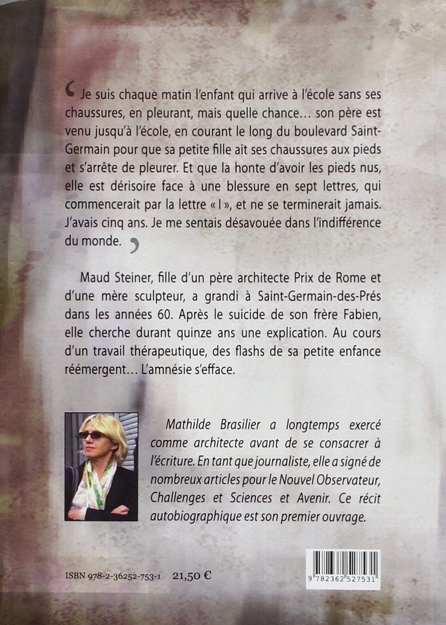 « Je suis chaque matin l’enfant qui arrive à l’école sans ses chaussures, en pleurant, mais quelle chance… son père est venu jusqu’à l’école, en courant le long du boulevard Saint-Germain pour que sa petite fille ait ses chaussures aux pieds et s’arrête de pleurer. Et que la honte d’avoir les pieds nus, elle est dérisoire face à une blessure en sept lettres, qui commencerait par la lettre « I », et ne se terminerait jamais. J’avais cinq ans. Je me sentais désavouée dans l’indifférence du monde. » Maud Steiner, fille d’un père architecte Prix de Rome et d’une mère sculpteur, a grandi à Saint-Germain-des-Prés dans les années 60. Après le suicide de son frère Fabien, elle cherche durant quinze ans une explication. Au cours d’un travail thérapeutique, des flashs de sa petite enfance réémergent… L’amnésie s’efface.