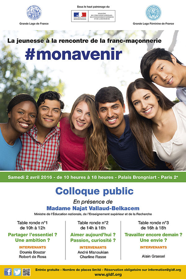 Les théories du complot, c’est mal…la franc-maçonnerie, c’est mieux: c’est ton avenir. En tout cas, c’est l’Education nationale qui y croit ferme puisqu’ils sponsorisent ce colloque public organisé par la Grande Loge de France et la Grande Loge Féminine de France. D’un côté, le gouvernement organise une mobilisation générale contre les chercheurs de vérité (qui dérangent fortement apparemment) et de l’autre, la ministre de la culture en personne vient assister à une opération séduction de la franc-maçonnerie visant spécifiquement la jeunesse.